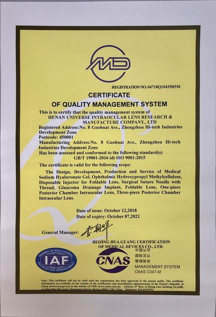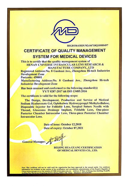 হেনান ইউনিভার্স ইন্ট্রাওকুলার লেন্স রিসার্চ অ্যান্ড ম্যানুফ্যাকচারিং কোং লিমিটেড 1991 সালে প্রতিষ্ঠিত হয়েছিল, এটি চীনের প্রথম উদ্যোগ যা ইন্ট্রোকুলার লেন্স এবং সম্পর্কিত পণ্য উত্পাদন করে। কোম্পানি রাস্তাটি গ্রহণ করার জন্য জোর দিয়েছিল যে প্রযুক্তি আমদানি অনেক বছর ধরে স্বাধীন উন্নয়নের সাথে মিলিত হয় এবং এটি বাস্তব জাতীয় প্রশাসন কর্তৃক তার পণ্য এবং বৈজ্ঞানিক গবেষণা কৃতিত্বের জন্য পুরস্কৃত হয়েছে। কোম্পানি ISO9001, ISO13485 মান নিয়ন্ত্রণ সিস্টেম সার্টিফিকেট অর্জন করেছে, যা আমাদের মান নিয়ন্ত্রণের জন্য একটি শক্ত ভিত্তি তৈরি করেছে।